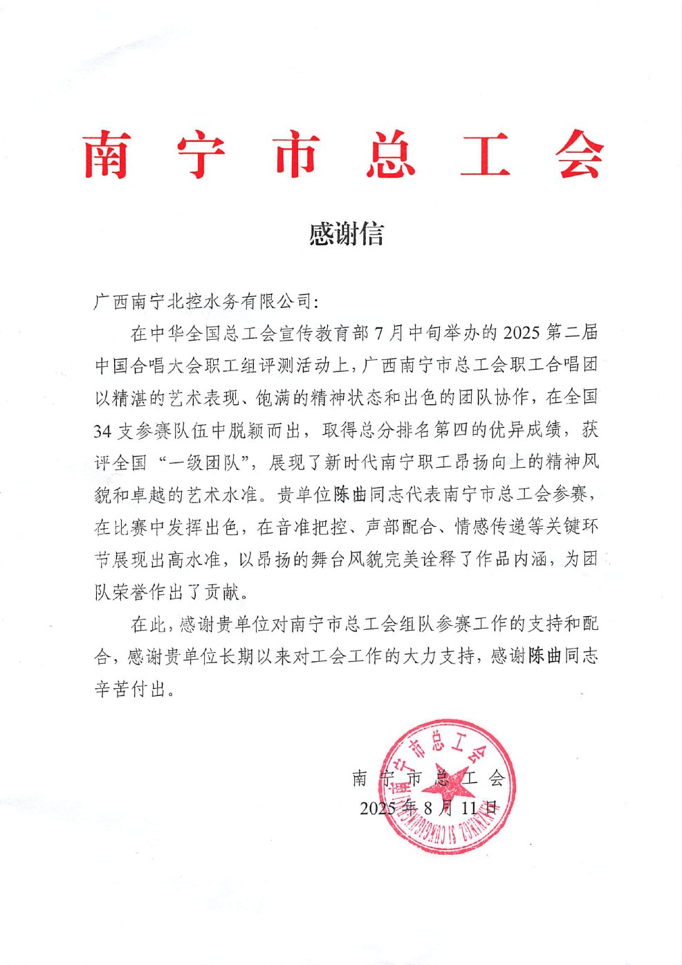 廣西南寧北控水務(wù)有限公司獲南寧市總工會(huì)致信表揚(yáng)2025-08-25